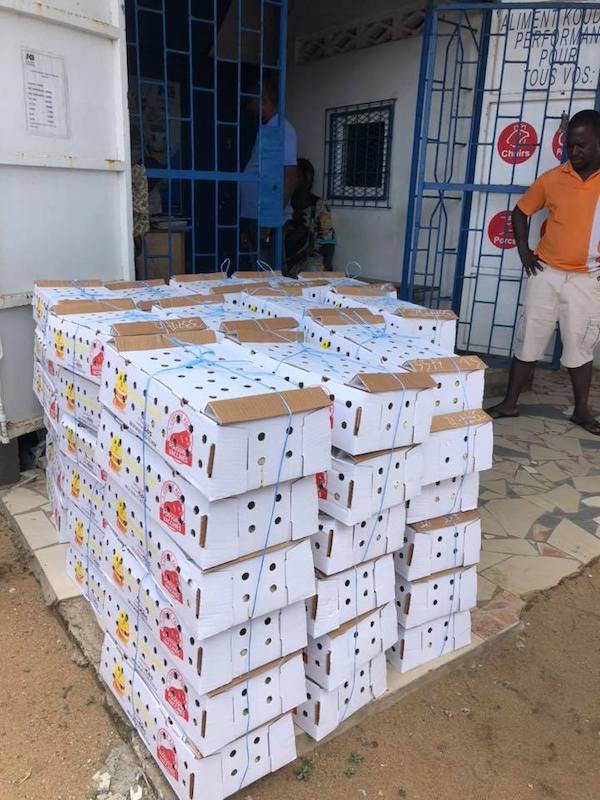 Nos poussins sont livrés dans des cartons blancs avec l’inscription « poussin vacciné ». Une occasion de dire aux clients, s’ils reçoivent leurs poussins dans un autre types de carton de faire attention car cela ne vient pas de Poussin d’OR.